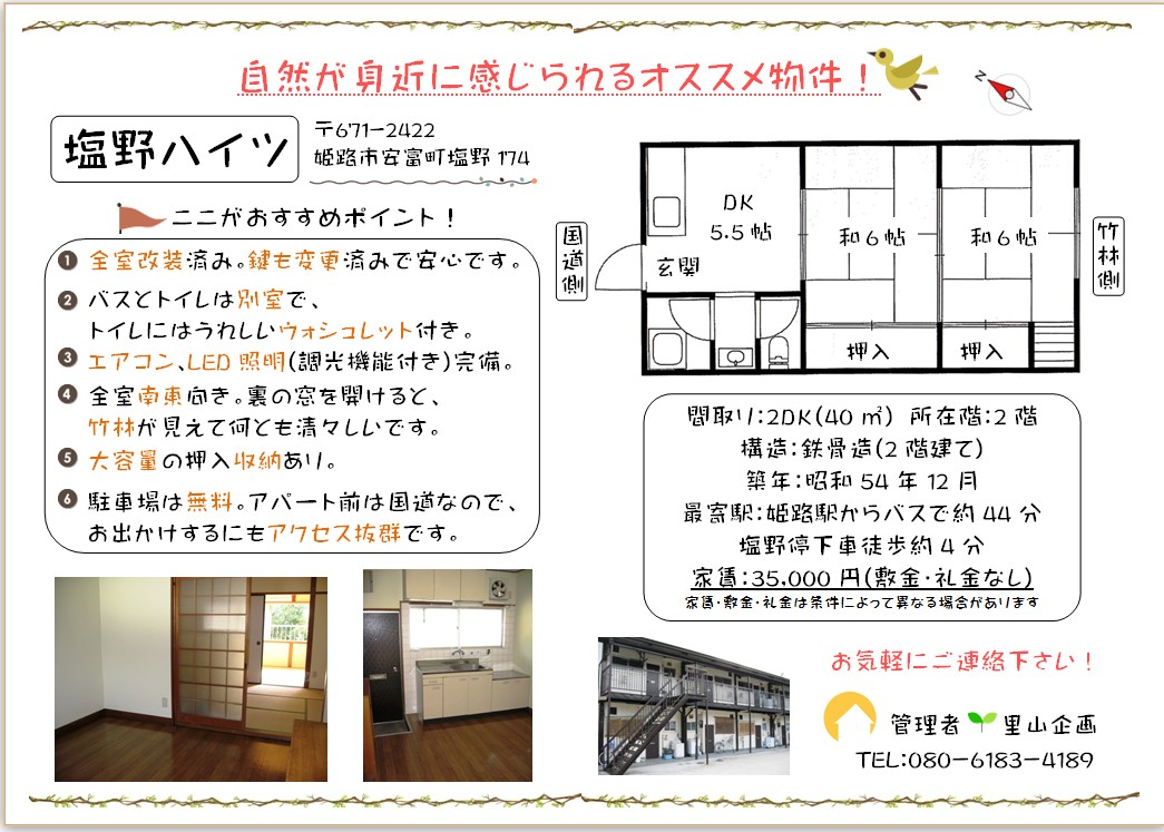 姫路市安富町塩野(塩野ハイツ) 姫路市北部の安富町あるハイツです。満室。 物件図面 物件概要 5帖キッチン、6帖和室X2 浴室、水洗トイレ(ウォシュレット付)、 敷金・礼金なし 2K(40平米)エアコン、駐車場付 家賃:契約済み